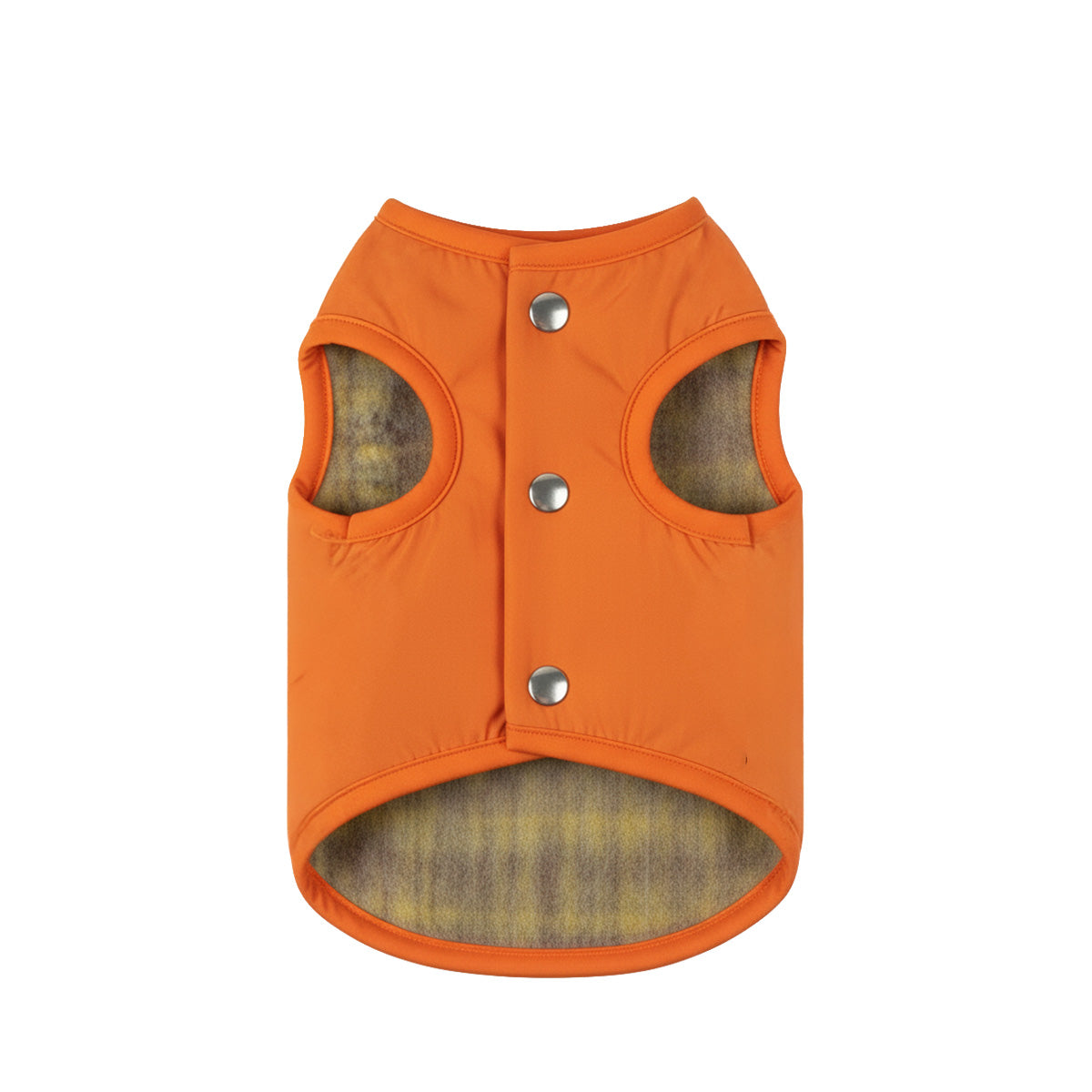 This versatile, two-in-one vest offers the best of both worlds. One side features premium, soft Japanese tweed/check fabric for a cozy, luxurious feel on dry days. Flip it to the other side for a high-visibility, waterproof orange polyester shell, perfect for wet weather and easy cleaning. Secured with snap buttons, this vest provides ultimate warmth, protection, and style in every season.