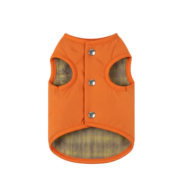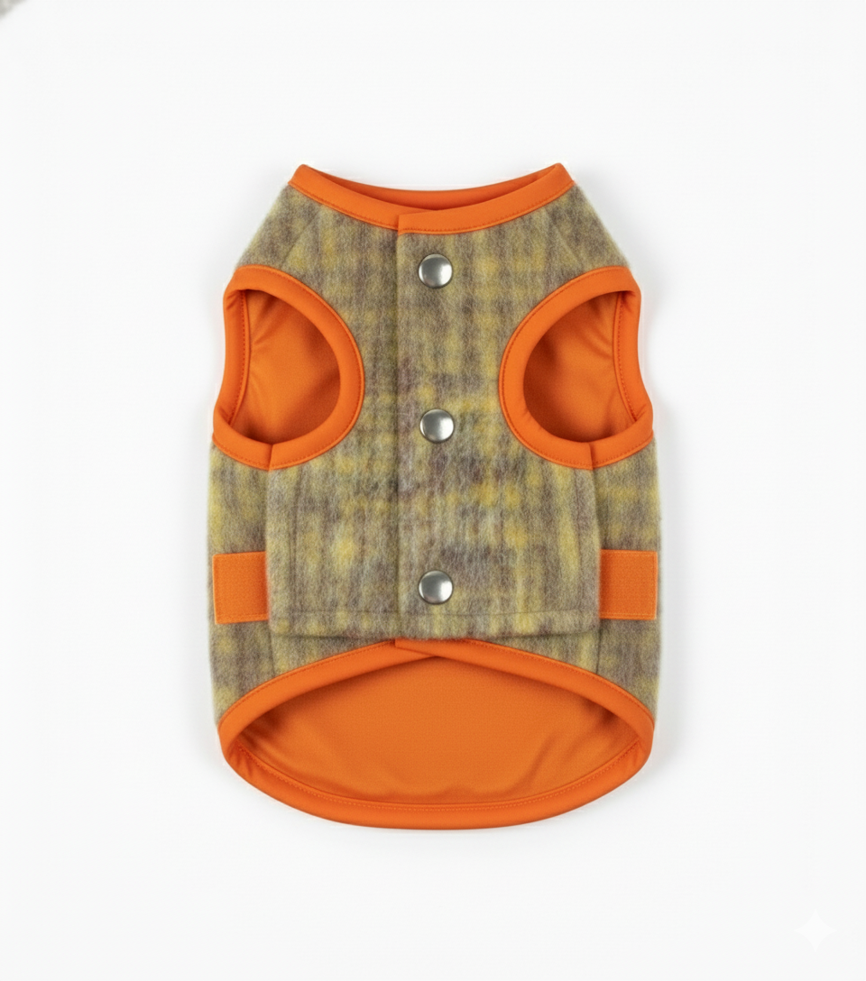 This versatile, two-in-one vest offers the best of both worlds. One side features premium, soft Japanese tweed/check fabric for a cozy, luxurious feel on dry days. Flip it to the other side for a high-visibility, waterproof orange polyester shell, perfect for wet weather and easy cleaning. Secured with snap buttons, this vest provides ultimate warmth, protection, and style in every season.